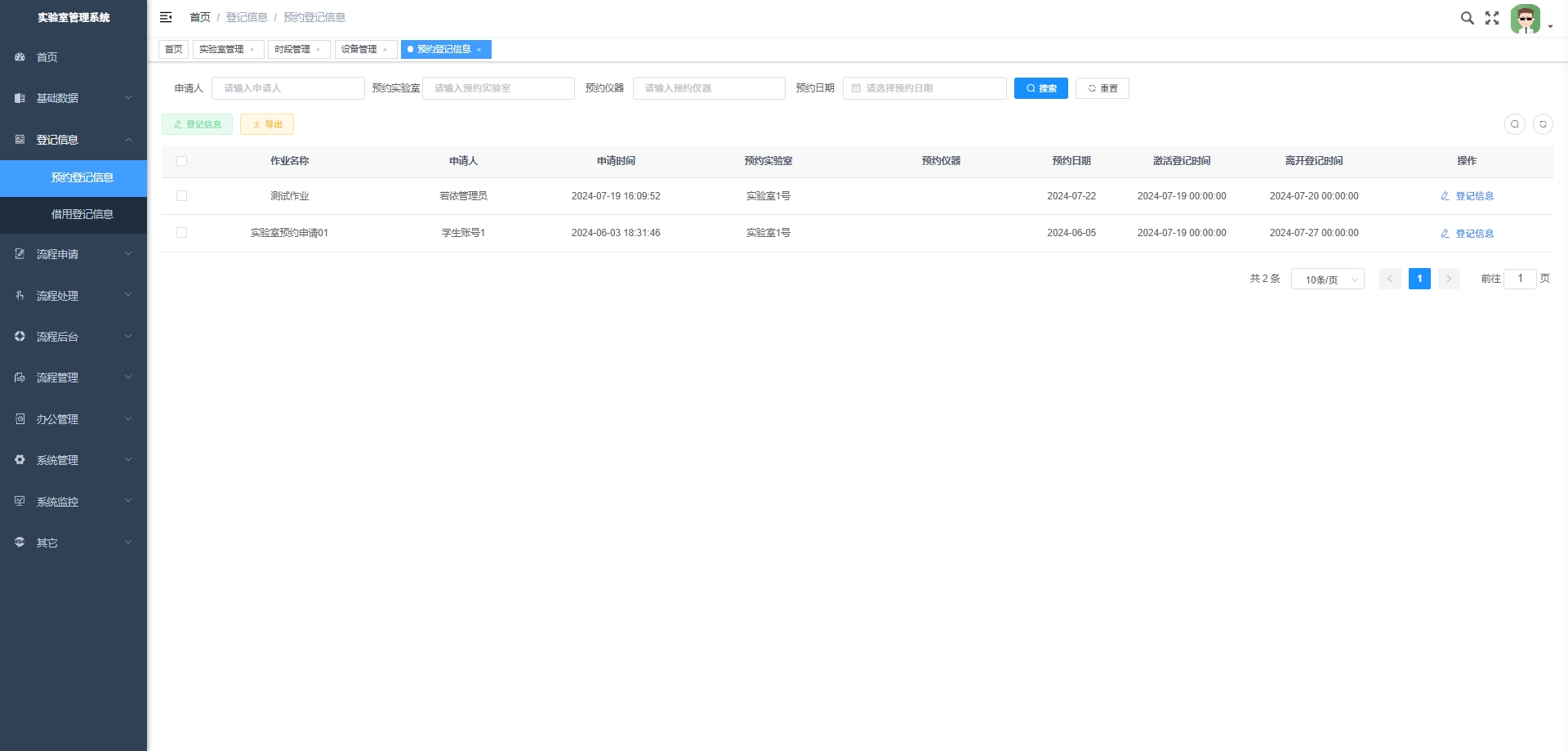 - 预约登记信息:记录实验室预约的详细信息,包括预约人、时间、目的和设备需求。