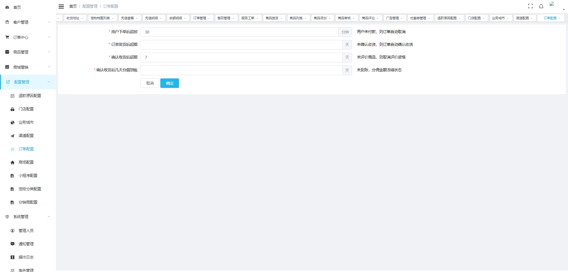 配置管理:灵活的配置选项,涵盖退款原因、门店信息、业务城市、渠道配置等,帮助商家根据自身业务需求进行个性化设置。
