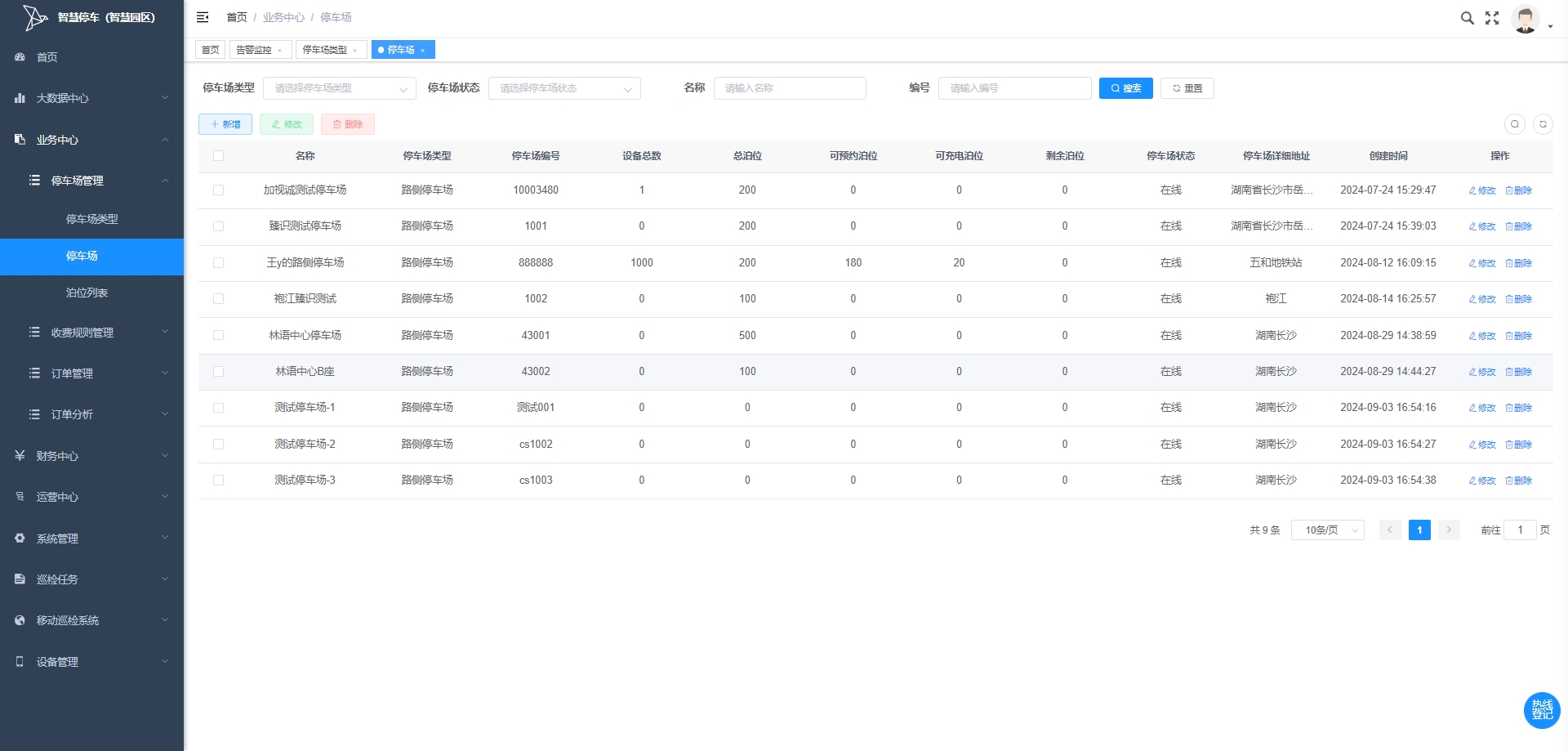 - 停车场:查看和管理各个具体停车场的详细信息。管理员可以在这里查看每个停车场的 状态、容量、当前使用情况等,并进行相应的操作,如调整开放时间、更新设施信息等。