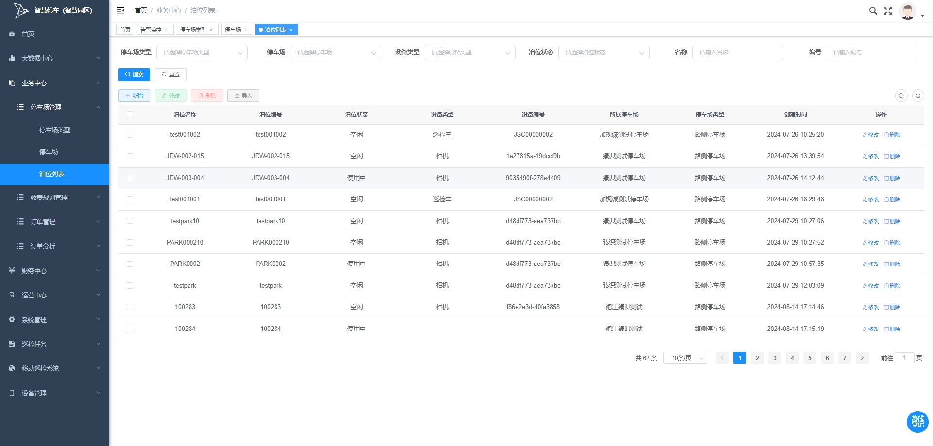 - 泊位列表:提供了对停车场内所有泊位的详细管理,管理员可以查看每个泊位的状态 (如空闲、占用)、位置、大小等信息,并进行管理操作,如分配特定泊位给用户、更 新泊位状态、维护泊位信息等。