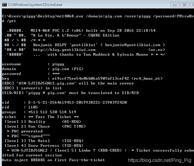 目前公开的利用方式有博客可循的,三种方式,利用msf进行ms14-068提权。利用ms14-068.exe工具集成minikatz功能直接写入。使用MS14-068.exe加minikataz进行权限提升