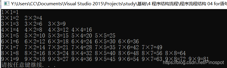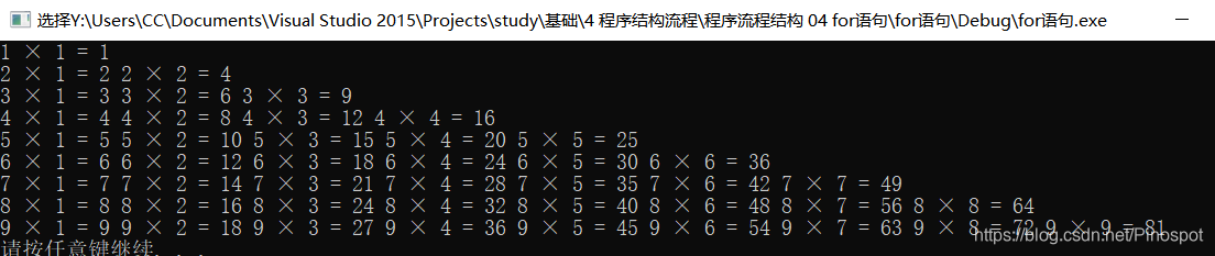 案例分析:首先确定乘法口诀表有九行九列,可以观察到,每一个式子都是列数×行数,且列数小于等于行数