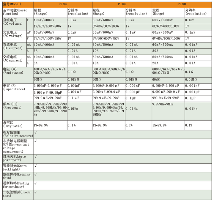 P180和P186、P184数字万用表是高精度、高性能的便携式测量仪器。该产品采用大屏LCD显示器,读数清晰,操作简便,支持多种测量功能,包括直流/交流电压、直流/交流电流、电阻、电容、频率、温度等参数测量。产品还具有自动关机、智能背光、非接触电压检测(NCV)等实用功能,满足专业技术人员和电子爱好者的多样化需求。