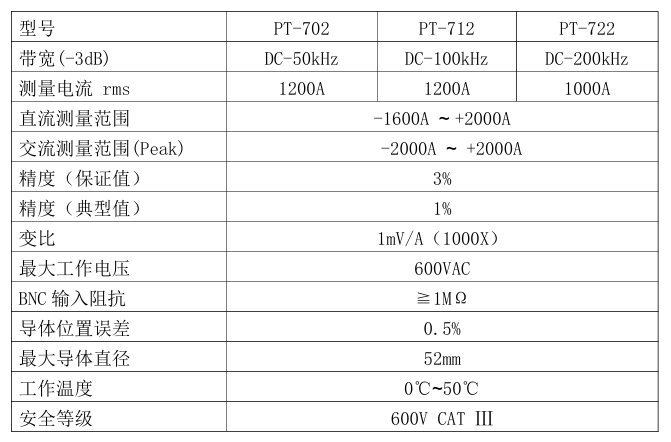 • 带宽:DC-50kHz(PT-702)/DC-100kHz(PT-712)/200kHz(PT-722)