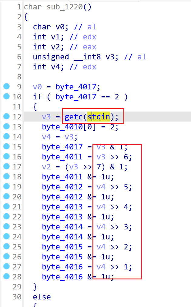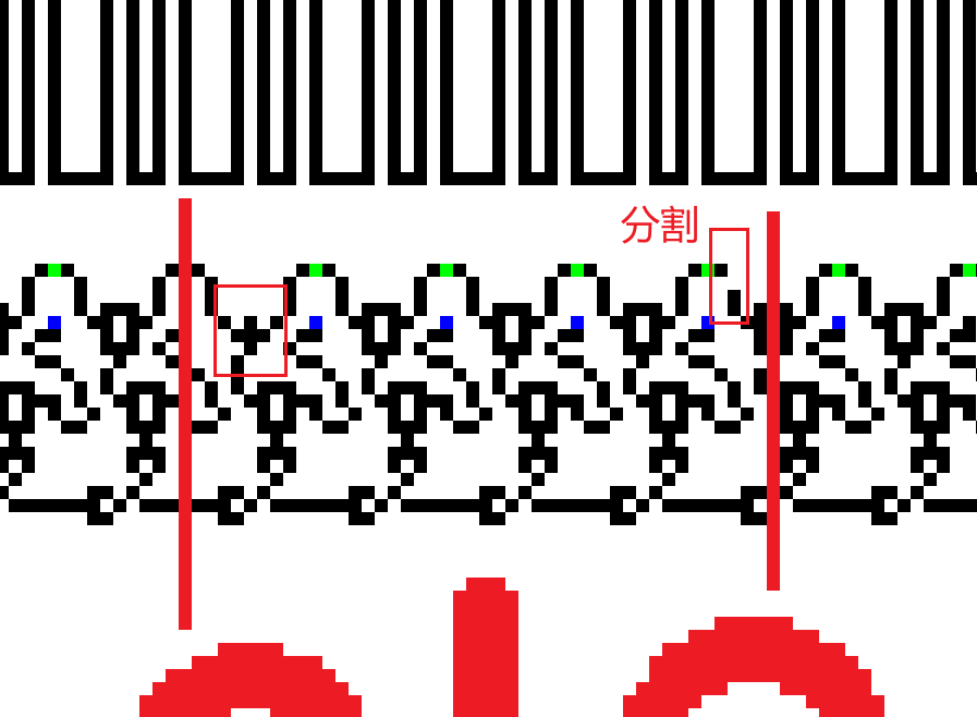 我们可以根据这些特征把整个图分割开,由于每个输入的字符都转化为8位二进制注入(绿色就是注入点),所以我每八个循环分割一次,最后得到29块,对应29个输入的字符