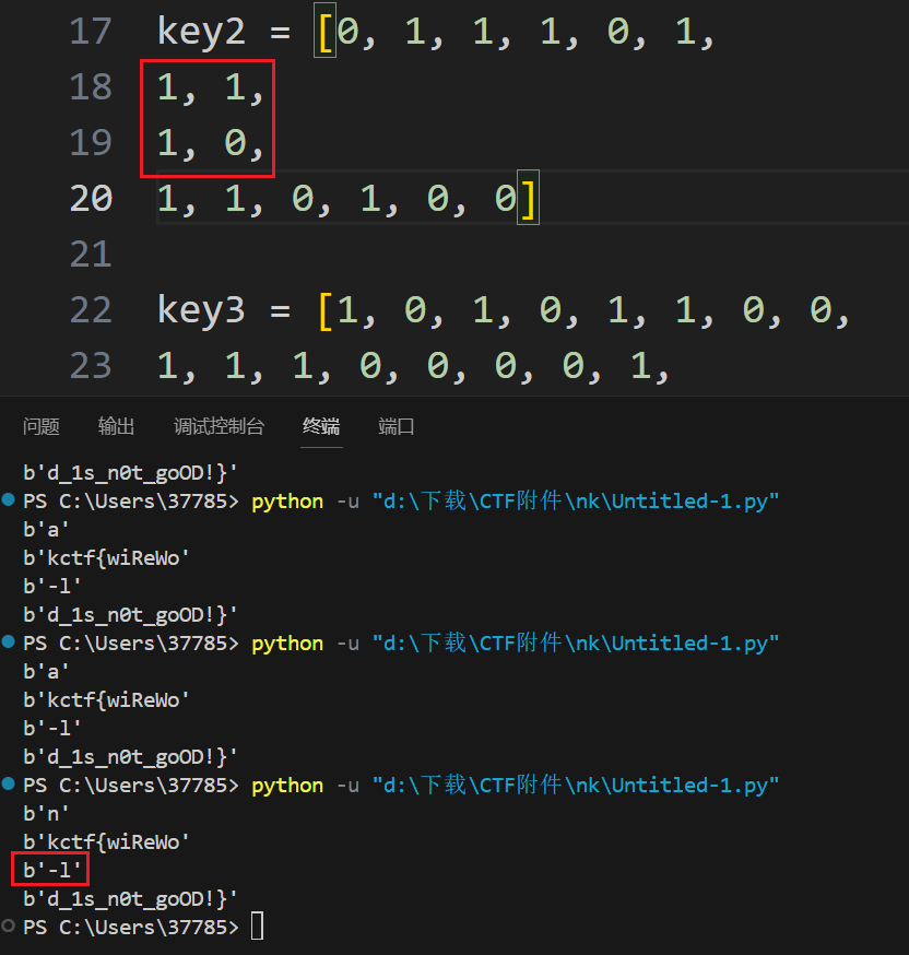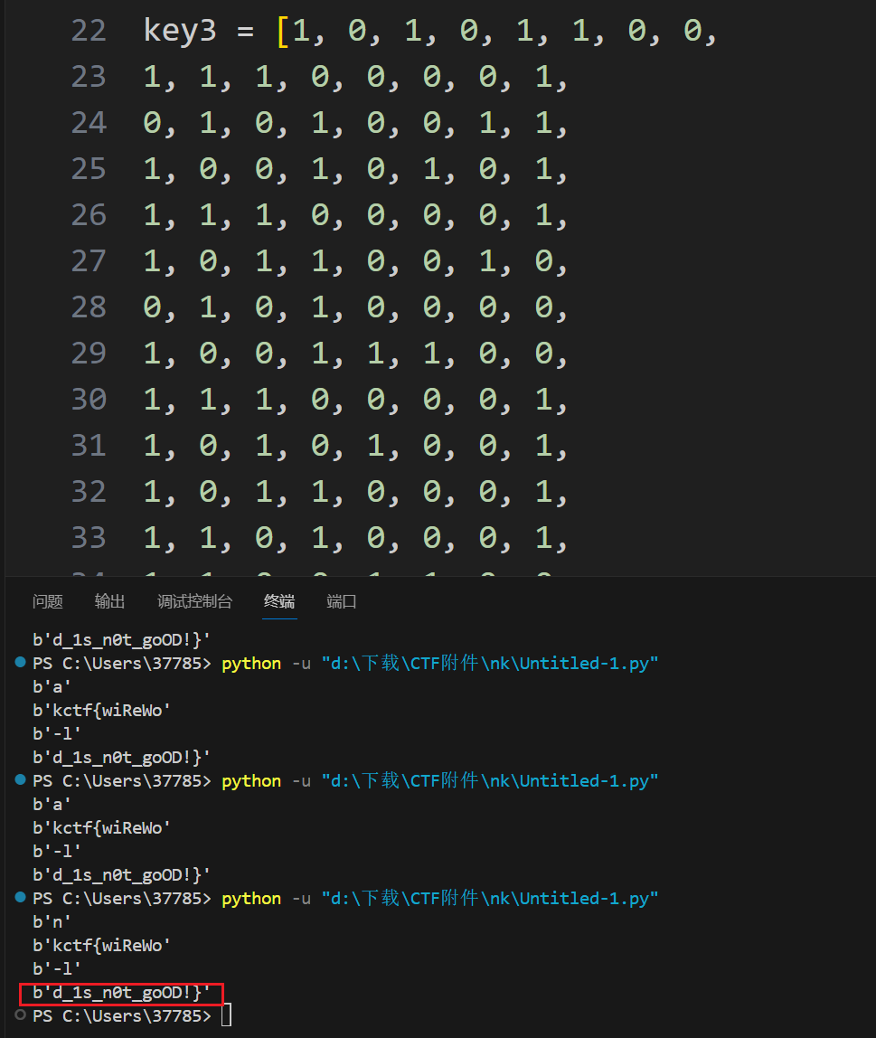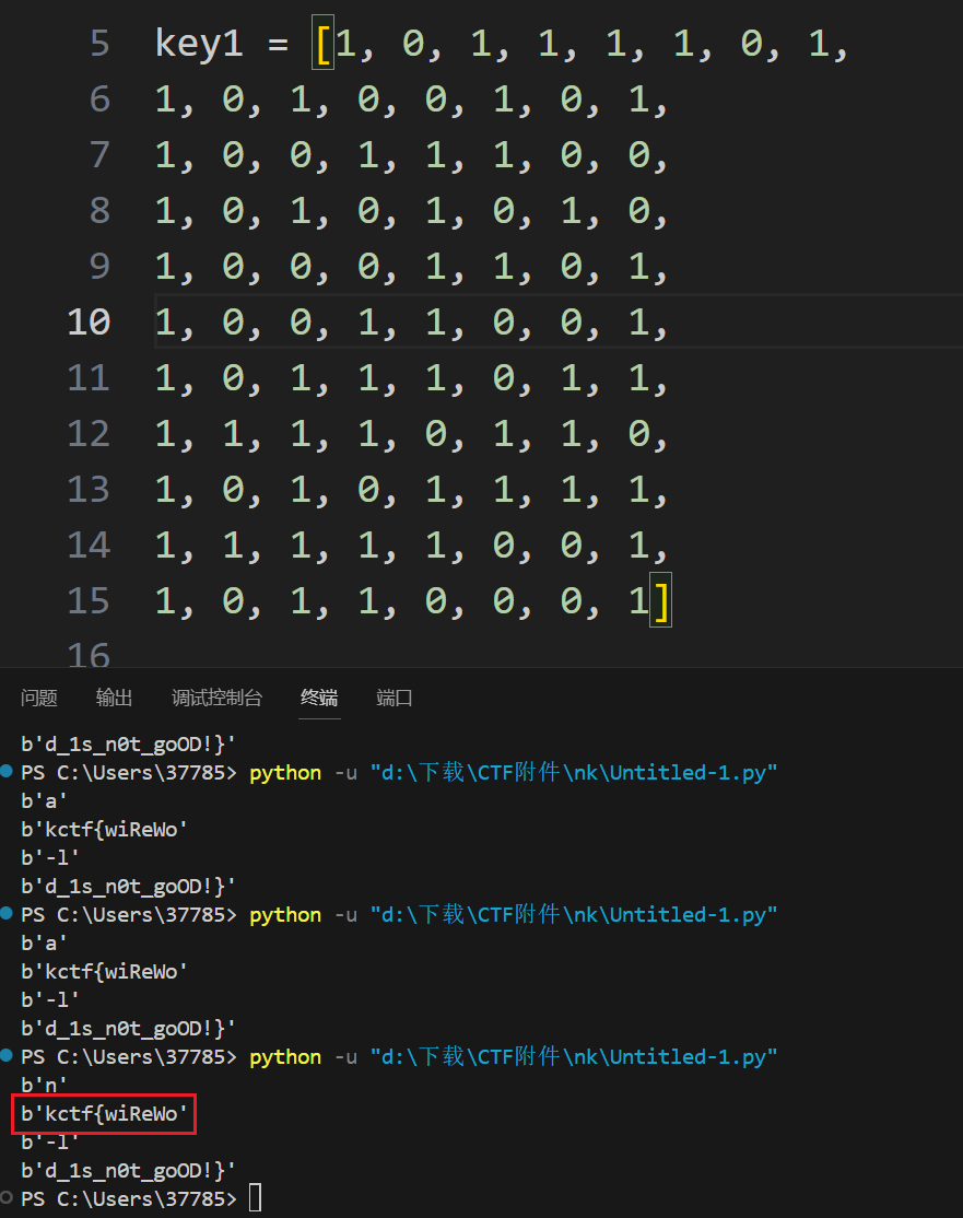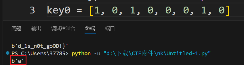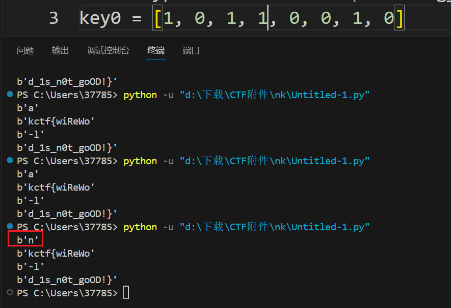 但反正就0和1两种情况,拿出前八位二进制试一下就会发现这一位为1的时候可以得到n(就是nkctf的开头),否则会得到a