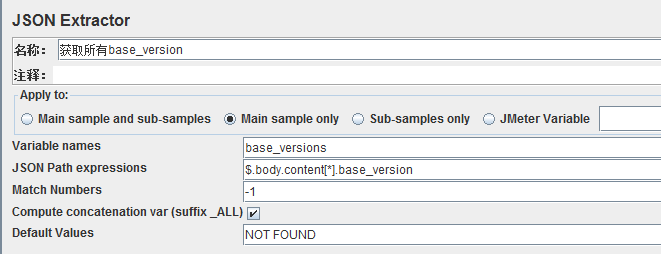 Compute concatenation var(suffix_ALL):是否统计所有,即将匹配到的所有值保存,名为“变量名_ALL”,使用场景需要获取的值有多个,后面需要对这一组数据进行操作,如: