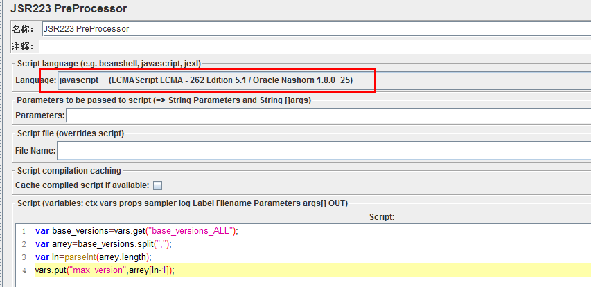 2、通过前置处理器JSR223 PreProcessor对返回的base_version进行处理,找出最大值(发现是列表最后一个)