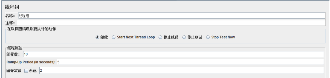 - b.Start Next Thread Loop:如遇到错误后面的请求将不再执行,等下一轮再开始执行。例如线程组中包含登录和发帖2个请求,若登录请求失败,发帖请求将不再执行,等下一次重新迭代,从登录开始执行。