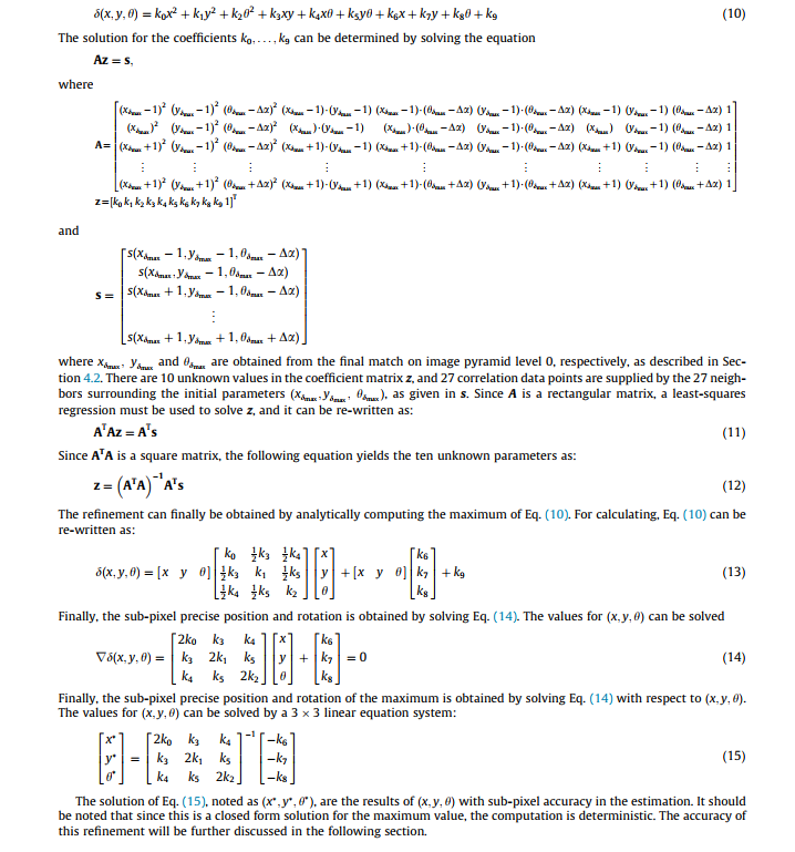 最近在看一篇台湾人开源的基于NCC的模板匹配代码,详见:https://github.com/DennisLiu1993/Fastest_Image_Pattern_Matching,在其代码中看到3D(X坐标,Y坐标和角度)的亚像素计算方法, 在后续和作者的沟通中,作者提供了该算法的论文出处。其详细的推到过程见下图: