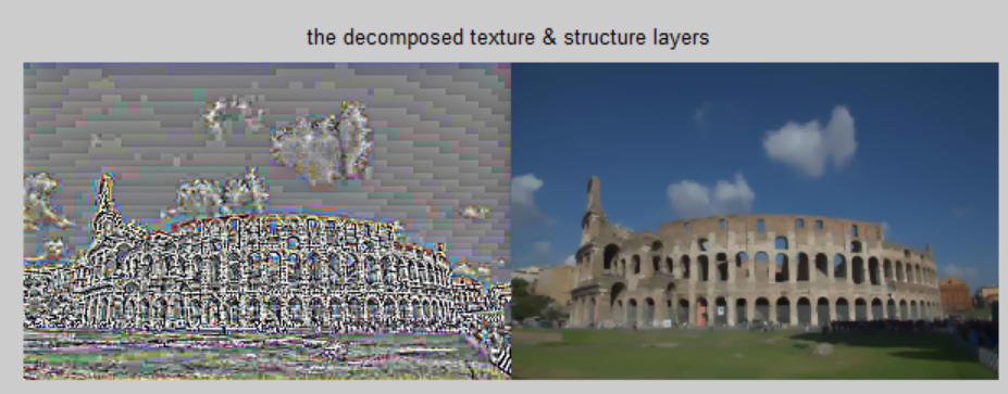 最近看到一篇文章讲IMAGE DECOMPOSITION,里面提到了将图像分为Texture layer和Structure layer,测试了很多方法,对于那些具有非常强烈纹理的图像,总觉得用TV去燥的方法分离的结果都比其他的方法都要好(比如导向、双边),比如下图: