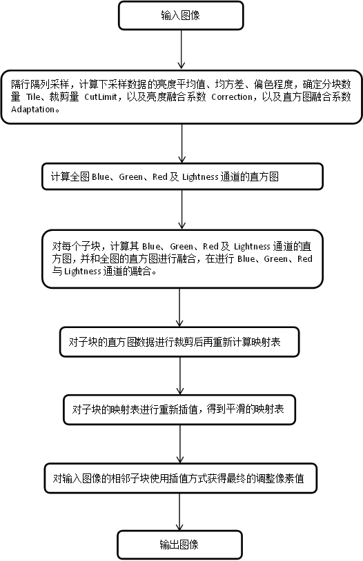 在很久前实现对比度受限的自适应直方图均衡化时,就曾经想过对该算法进行一定程度的扩展,之后使用自动对比度和自动色阶代替直方图均衡化也提出了新的算法,也达到了不错的效果。本文进一步对该算法进行一定程度的扩展和补充优化。