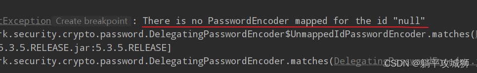 这个问题其实不难,通俗点讲就是springsecurity需要一个密码器来进行加密、解密。其中查找官方文档我们知道密码的存储格式是“{id}…”.前面的id是加密方式,后面跟着的是加密后的密码。所以,当从数据库获取到密码时,会先找到定义加密方式,如果找不到就认为id是null。所以说会报错。
