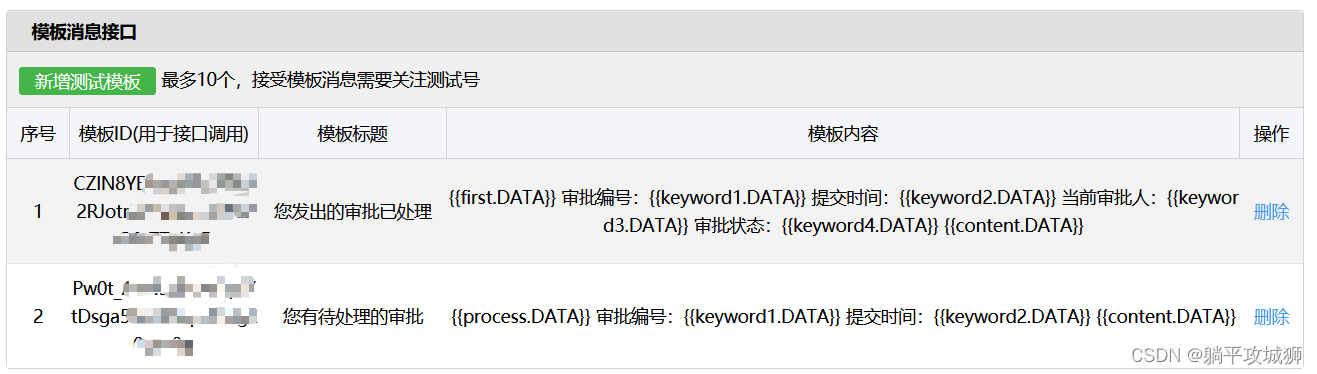 在上篇提到的公众号测试平台中可以找到如下 模板消息接口,点击新增测试模板就可以自定义