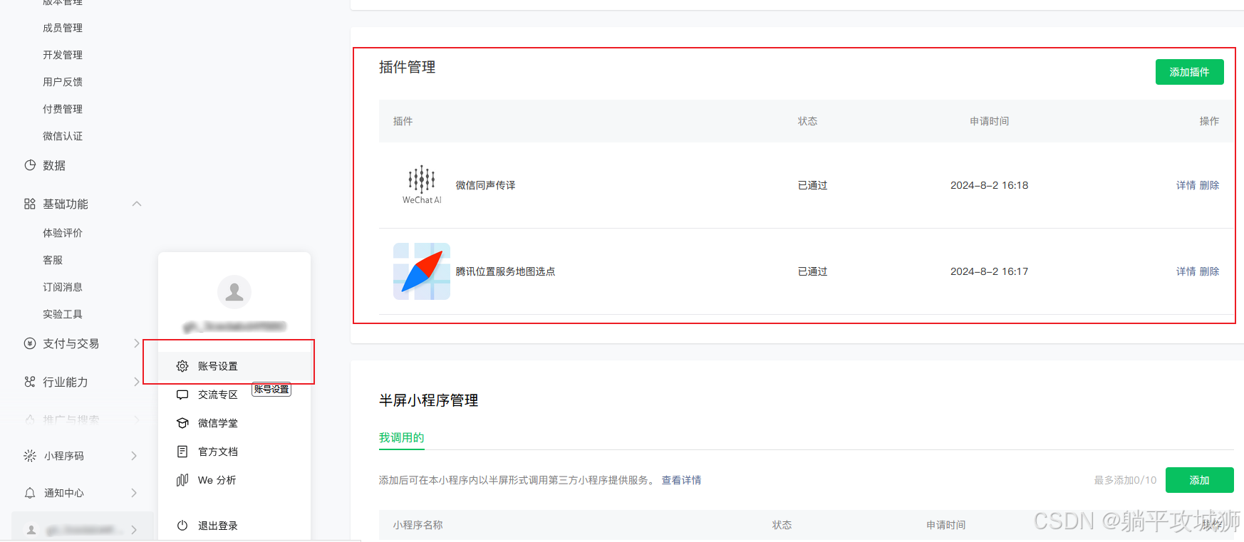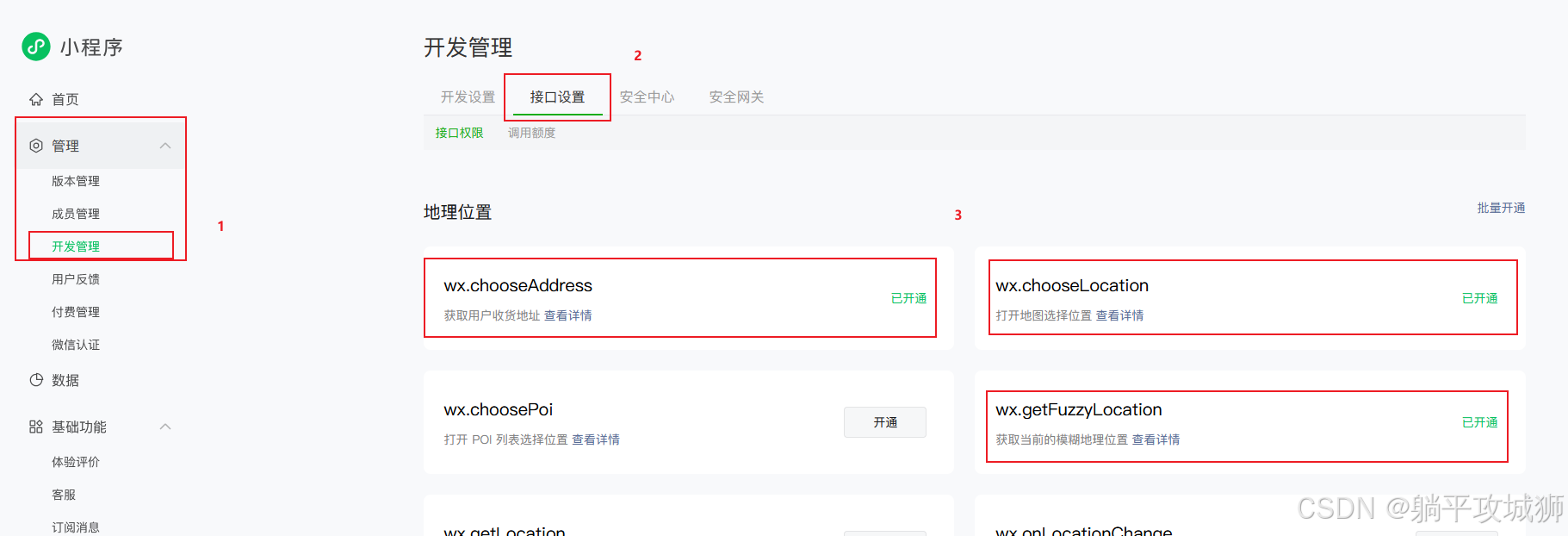 登录微信小程序后台后,找到管理-开发管理-接口设置申请添加如下三个接口