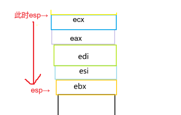压入第一个元素ebx时,esp栈顶指针位置就往上走,指到ebx顶端