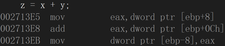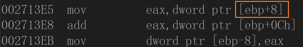 我们执行move指令就可以把变量拿过来,我们再把这两个变量的值相加,放在ebp-8中