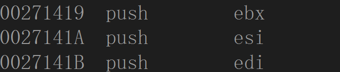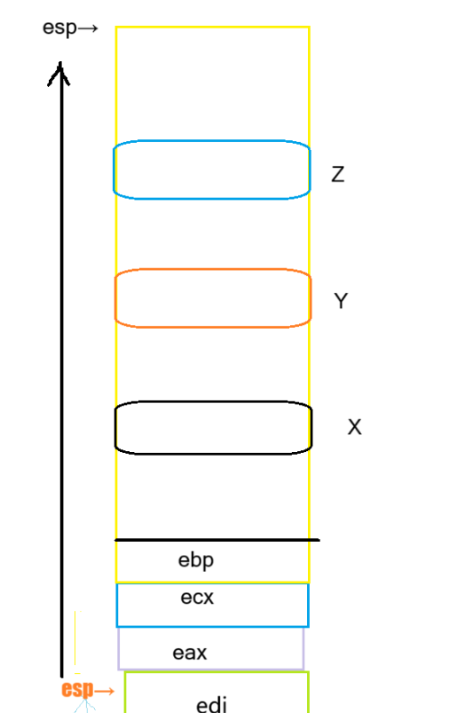 压入第三个元素edi时,同理esp值再次变化,esp栈顶指针位置继续往上走,指到edi顶端