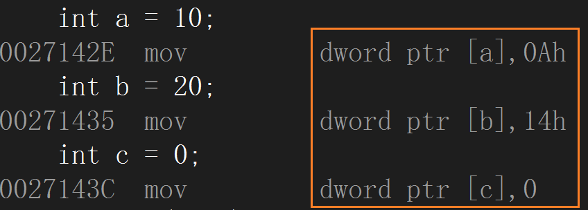 假设每一行是4个字节,我们可以看到第一条指令时把变量a的值存入main函数的一块区域