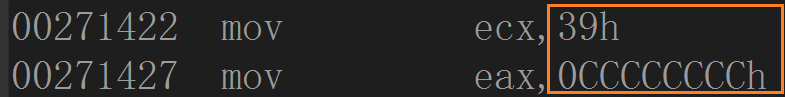 我们把39h这个值存入ecx中,把0CCCCCCCCh这个值存入eax中,这些值之后会用到