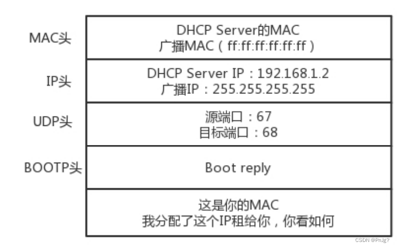 此时,由于还没有得到 DHCP Server 的最后确认,客户端仍然使用 0.0.0.0 为源 IP 地址、 255.255.255.255 为目标地址进行广播。在 BOOTP 里面,接受某个 DHCP Server 的分配 的 IP。当 DHCP Server 接收到客户机的 DHCP request 之后,会广播返回给客户机一个 DHCP ACK 消息包,表明已经接受客户机的选择,并将这一 IP 地址的合法租用信息和其他的配置 信息都放入该广播包,发给客户机,欢迎它加入网络大家庭。