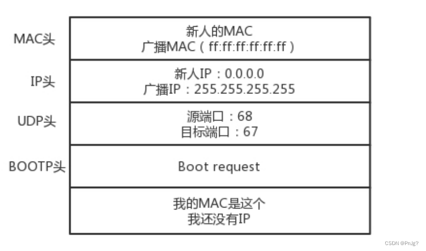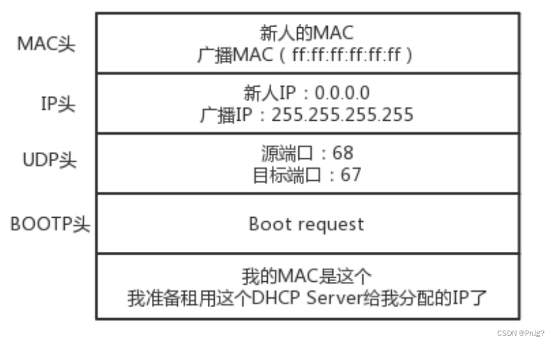 当一台机器新加入一个网络的时候,谁都不知道,只知道自己的MAC地址,这时候就根据DHCP Discover: 使用 IP 地址 0.0.0.0 发送了一个广播包,目的 IP 地址为 255.255.255.255。广播包封装了 UDP,UDP 封装了 BOOTP,个广播包里面,新人大声喊:我是新来的(Boot request),我的 MAC 地址是这 个,我还没有 IP,谁能给租给我个 IP 地址!