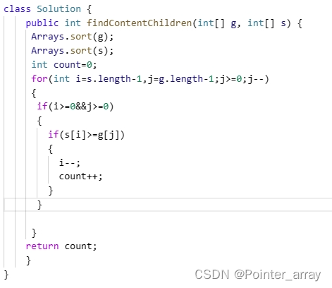 解题思路:通过遍历饼干的数量再让饼干和人的胃口比较大小,如果饼干大于人的胃口 就让饼干减少 人的胃口数组也减少 计数++反之 人的胃口数组减少