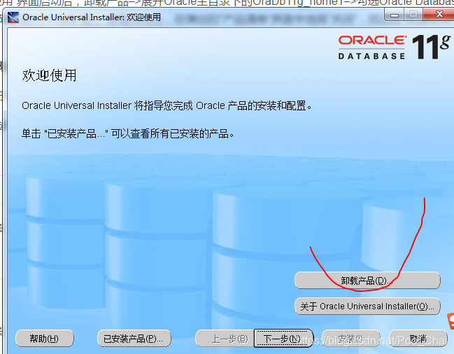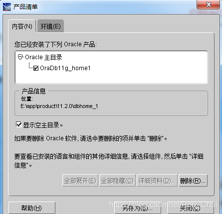 “欢迎使用”界面启动后,卸载产品–>展开Oracle主目录下的OraDb11g_home1–>勾选Oracle Database 11g11.2.0.1.0–>删除–>在弹出的确认窗口中选择“是”。卸载完成后,在弹出的“产品清单”界面中选择“关闭”,然后在“欢迎使用”界面中选择“取消”来退出界面。
