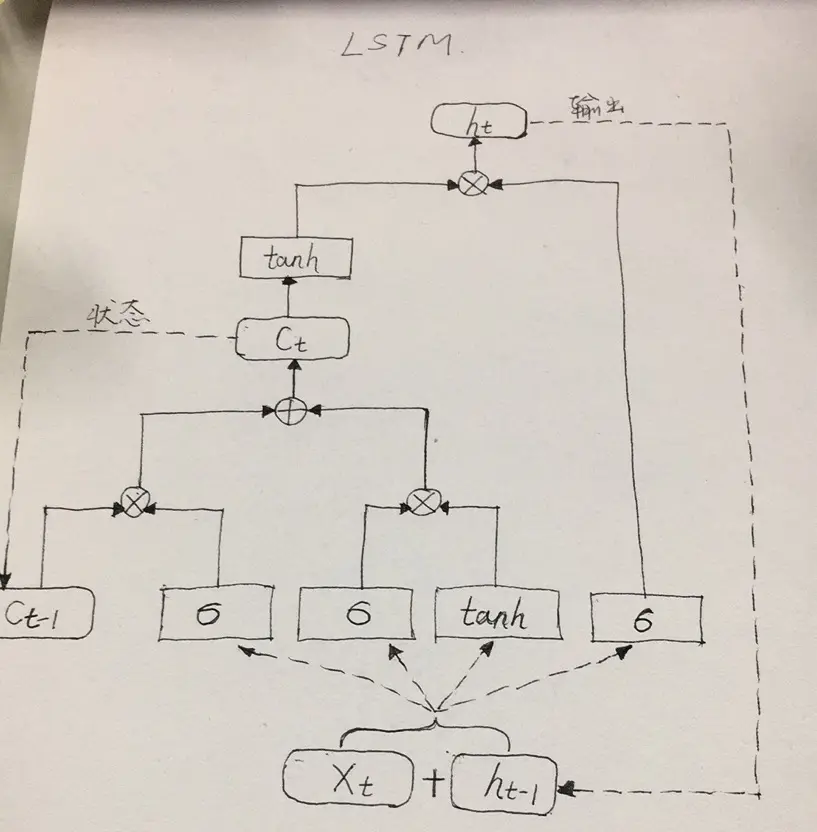 其中,四个黄色的小矩形就是普通神经网络的隐藏层结构,其中第一、二和四的激活函数是sigmoid,第三个的激活函数是tanh。t时刻的输入X和t-1时刻的输出h(t-1)进行拼接,然后输入cell中,其实可以这样理解,我们的输入X(t)分别feed进了四个小黄矩形中,每个小黄矩形中进行的运算和正常的神经网络的计算一样(矩阵乘法),有关记忆的部分完全由各种门结构来控制(就是0和1),同时在输入时不仅仅有原始的数据集,同时还加入了上一个数据的输出结果,也就是h(t-1),那么讲来LSTM和正常的神经网络类似,只是在输入和输出上加入了一点东西。cell中可以大体分为两条横线,上面的横线用来控制长时记忆,下面的横线用来控制短时记忆。关于LSTM我通过参考画了一张图,如下: