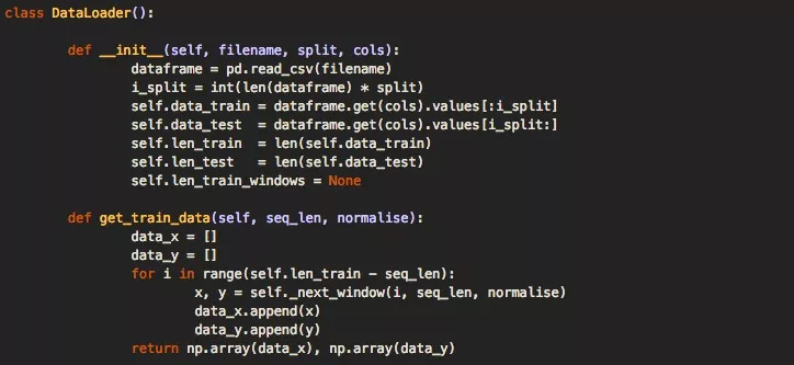 为了加载这些数据,我们在代码中创建了一个DataLoader类。你可能会注意到,在初始化DataLoader对象时,会传入文件名、传入确定用于训练与测试的数据百分比的拆分变量,以及允许选择一列或多列数据的列变量用于单维或多维分析。