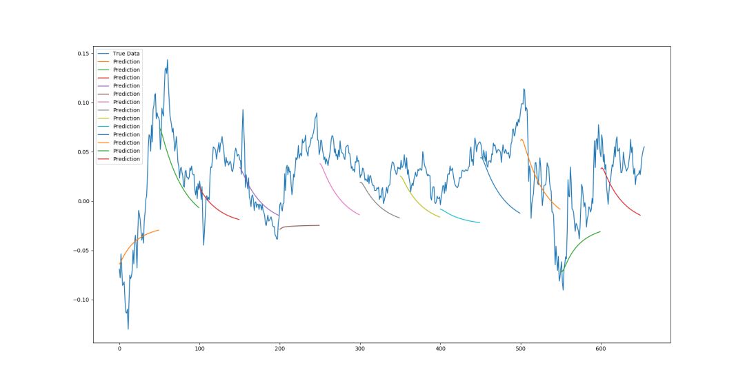 最后,我们对该模型进行了第三种预测,我将其称为多序列预测。这是完整序列预测的混合产物,因为它仍然使用测试数据初始化测试窗口,预测下一个点,然后用下一个点创建一个新窗口。但是,一旦输入窗口完全由过去预测点组成,它就会停止,向前移动一个完整的窗口长度,用真实的测试数据重置窗口,然后再次启动该过程。