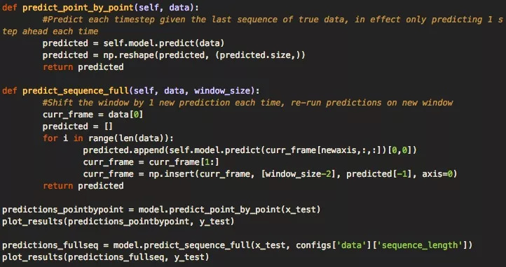 对于输出,我们会进行两种类型的预测:一是逐点预测,即先让模型预测单个点的值,在图中绘出位置,然后移动滑动窗口,用完整的测试数据预测下个点的值。二是预测一个完整序列,即只用训练数据的第一部分初始化一次训练窗口,然后就像逐点预测一样,不断移动滑动窗口并预测下一个点。