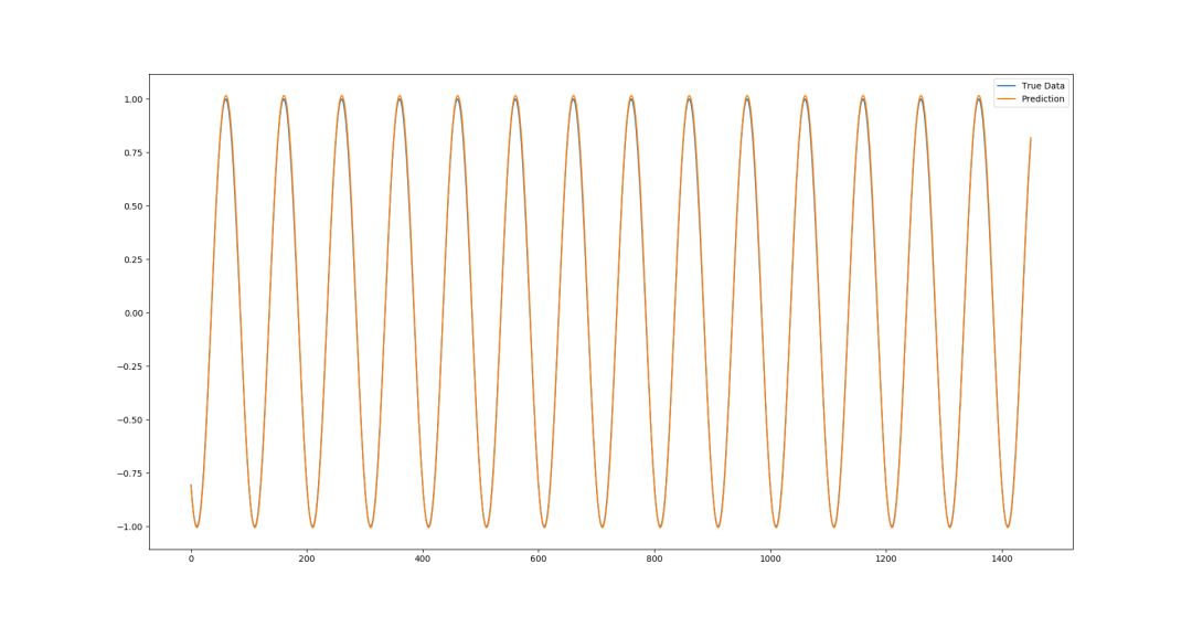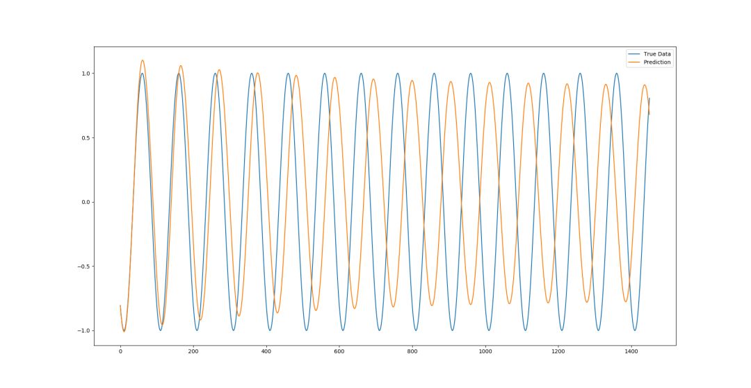 我们可以从上面两幅图中发现,如果用第二种方法进行预测,随着测试集中被不断加入新的预测数据点,模型的性能会渐渐下降,预测结果和真实结果的误差越来越大。但正弦函数是一个非常简单的零噪声震荡函数,总体来看,我们的模型在没有过拟合的同时还是能很好的模型曲线大致情况的。