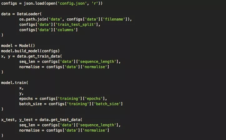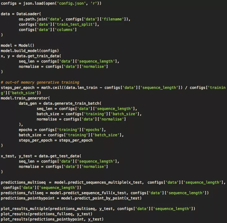 处理完数据后,我们就可以和之前一样运行模型。但是,我们做了一个重要的修改:不使用model.train() ,而是用model.traingenerator()。这样做是为了在处理大型数据集时节约内存,前者会把完整数据集全部加载到内存中,然后一个窗口一个窗口归一化,容易内存溢出。此外,我们还调用了Keras的fitgenerator()函数,用python生成器动态训练数据集来绘制数据,进一步降低内存负担。