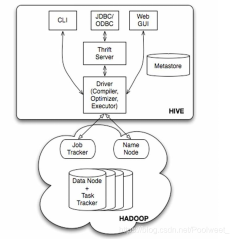 - 用户接口主要有三个:Cli,Client和WebGUI,其中最常用的是cli,cli启动的时候会同时启动一个hive副本,client是hive客户端,用户连接到hiveServer.在启动client模式的时候,需要指出hiveServer所在的节点,并且在该节点启动hiveServer.WUI是通过浏览器也能访问Hive