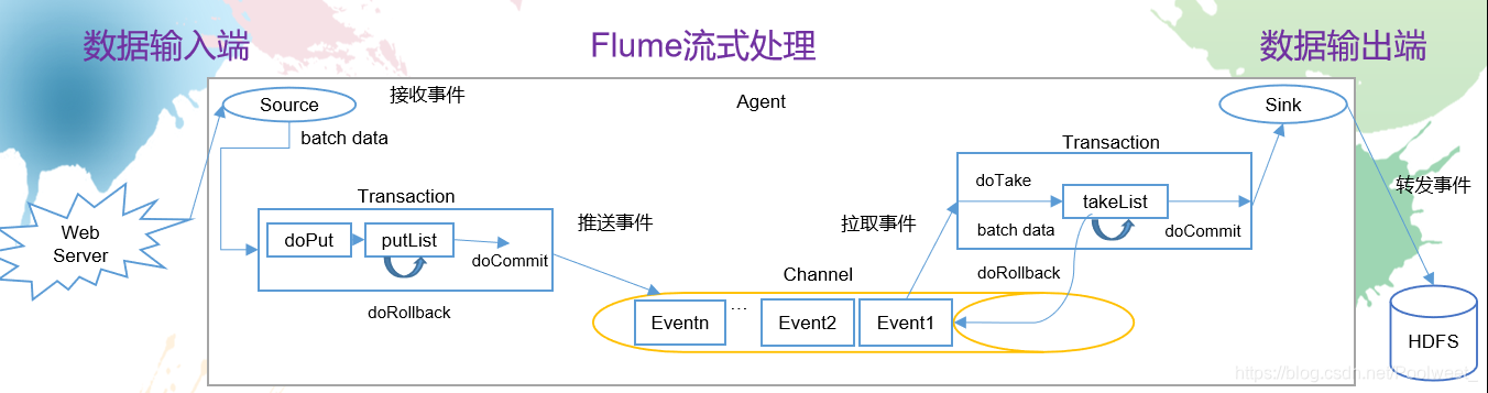 Flume的事务机制(类似数据库的事务机制):Flume使用两个独立的事务分别负责从Soucrce到Channel,以及从Channel到Sink的事件传递。比如spooling directory source 为文件的每一行创建一个事件,一旦事务中所有的事件全部传递到Channel且提交成功,那么Soucrce就将该文件标记为完成。同理,事务以类似的方式处理从Channel到Sink的传递过程,如果因为某种原因使得事件无法记录,那么事务将会回滚。且所有的事件都会保持到Channel中,等待重新传递。