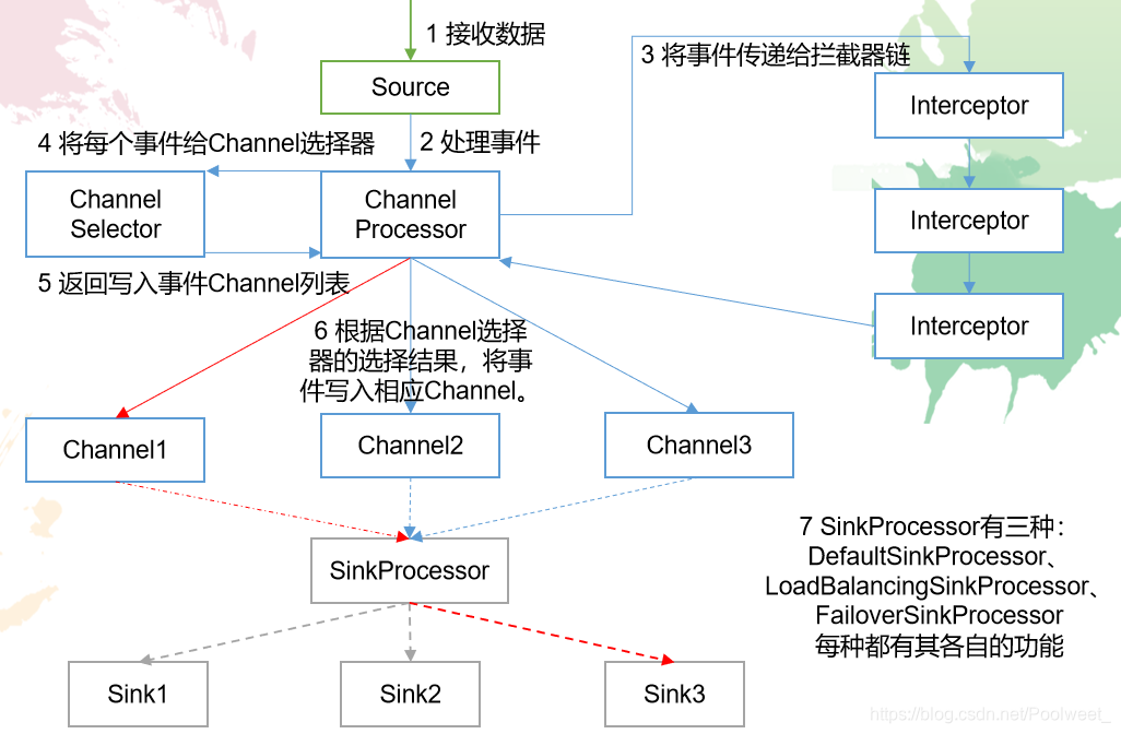 DefaultSinkProcessor对应的是单个的Sink,LoadBalancingSinkProcessor和FailoverSinkProcessor对应的是Sink Group,LoadBalancingSinkProcessor可以实现负载均衡的功能,FailoverSinkProcessor可以实现故障转移的功能。