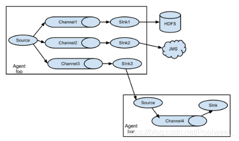 Flume支持将事件流向一个或者多个目的地。这种模式可以将相同数据复制到多个channel中,或者将不同数据分发到不同的channel中,sink可以选择传送到不同的目的地。