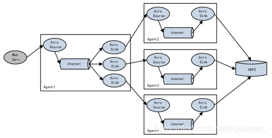 这种模式是将多个flume顺序连接起来了,从最初的source开始到最终sink传送的目的存储系统。此模式不建议桥接过多的flume数量, flume数量过多不仅会影响传输速率,而且一旦传输过程中某个节点flume宕机,会影响整个传输系统。