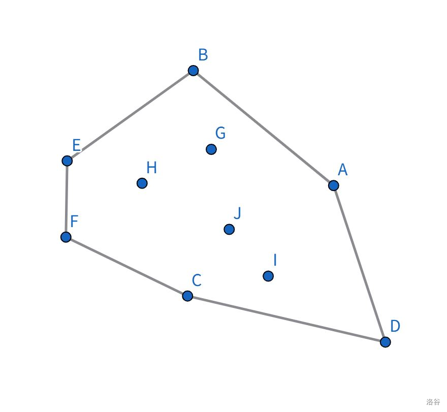 在这张图片里,一个平面上有数个点,同时还有一个凸多边形将这数个点完全覆盖,那么使这个图形面积最小的凸多边形就称为凸包。更具象化地讲,就是用手撑开一个橡皮筋并用其把一堆钉子围住,然后再松开手使橡皮筋收缩,那么最终橡皮筋形成的图形便是这些钉子的凸包。
