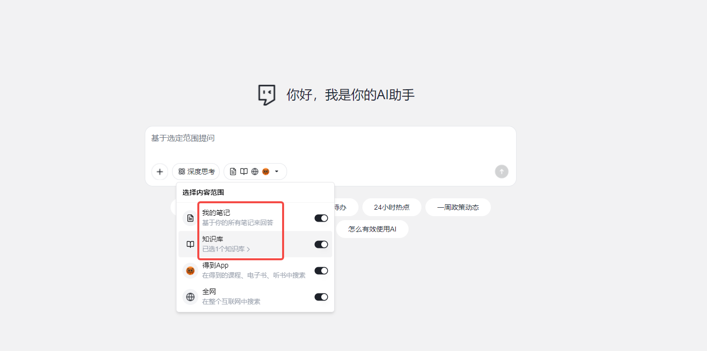 这是我的实践。左侧是我的输入,包含对某个主题的深度思考、平常研究的案例、专业资料等,将他们构成AI决策的知识库。遇到问题,我便在此快速调用“第二大脑”,高效推进工作。