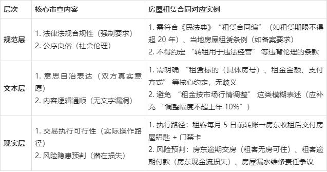 合同审核需穿透 “规范 - 文本 - 现实” 三层逻辑,每层各有侧重且相互衔接,以下结合房屋租赁合同案例具体拆解:
