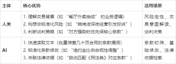 协同场景:AI 初筛条款漏洞→人类判断漏洞是否属于 “核心风险”→AI 提供修改草案→人类结合交易背景优化。
