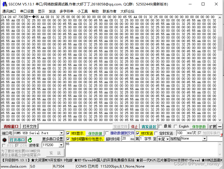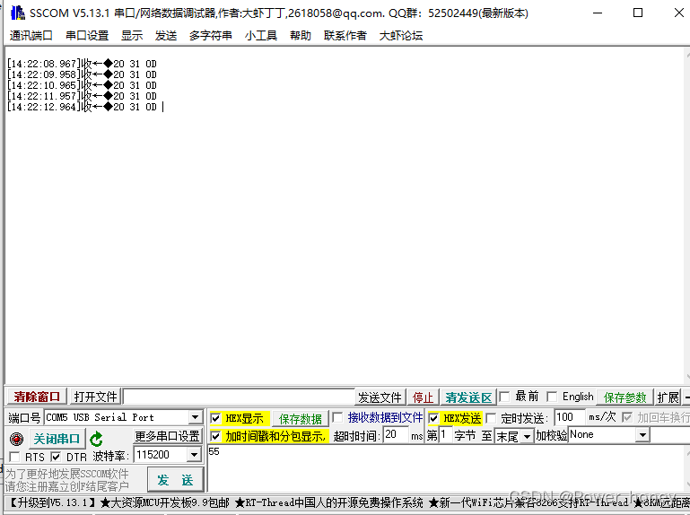 利用串口助手进行观察,发现指令一直在循环发送,不符合只发送一次的要求。