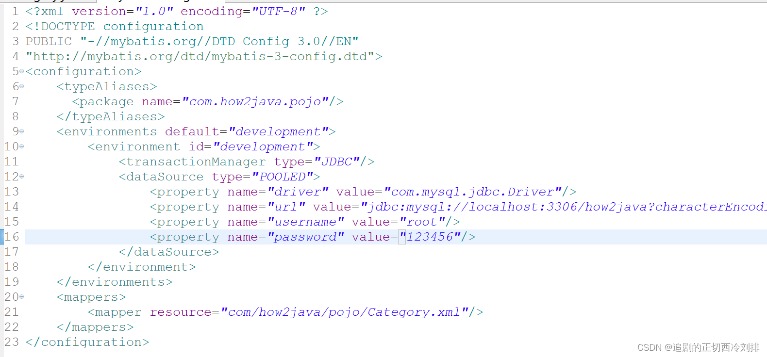 语句<package name="com.how2java.pojo"/>配置了别名,自动扫描com.how2java.pojo下的类型,使得在后续配置文件Category.xml中使用resultType的时候,可以直接使用Category简化操作,而不必写全com.how2java.pojo.Category
