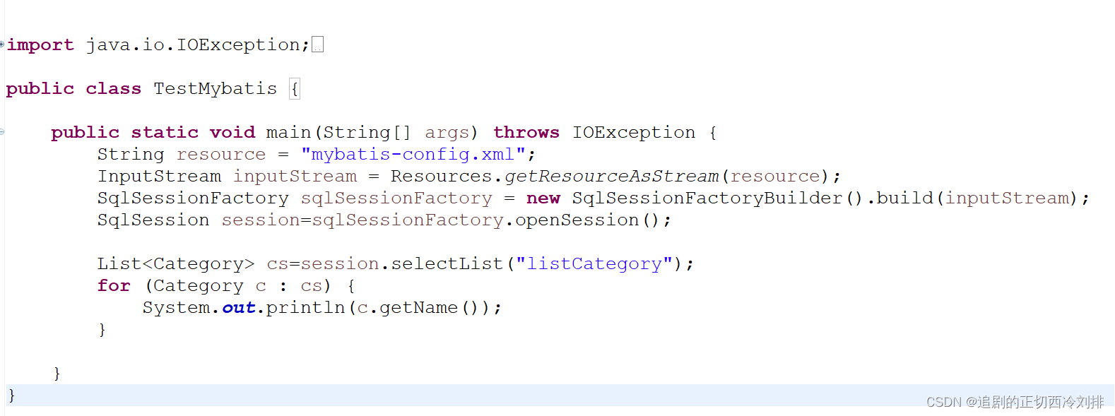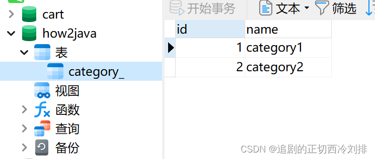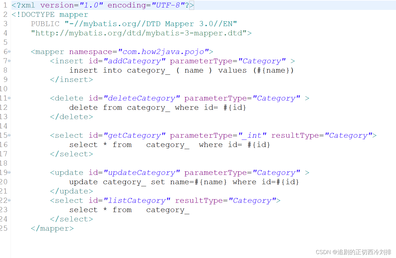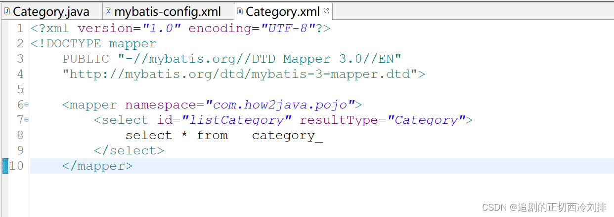 select * from category_,这条sql语句用id: listCategory 进行标示以供后续代码调用。resultType="Category" 表示返回的数据和Category关联起来,这里本应该使用的是 com.how2java.pojo.Category, 但是因为上一步配置了别名,所以直接使用Category就行了。