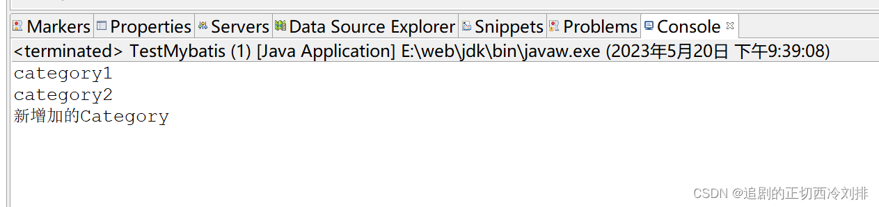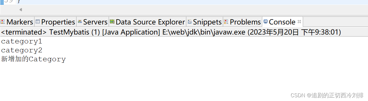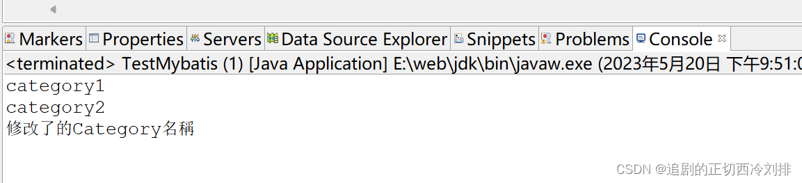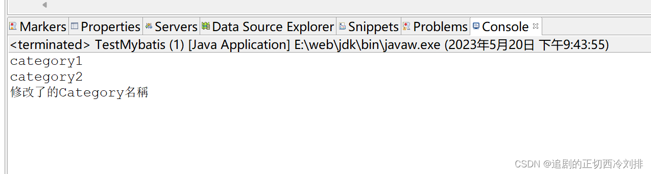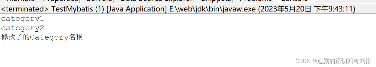 在配置文件category.xml中提供CRUD对应的sql语句,当后续需要执行什么操作的时候通过session.insert调用对应的SQL语句,#{name}会自动获取c对象的name属性值。