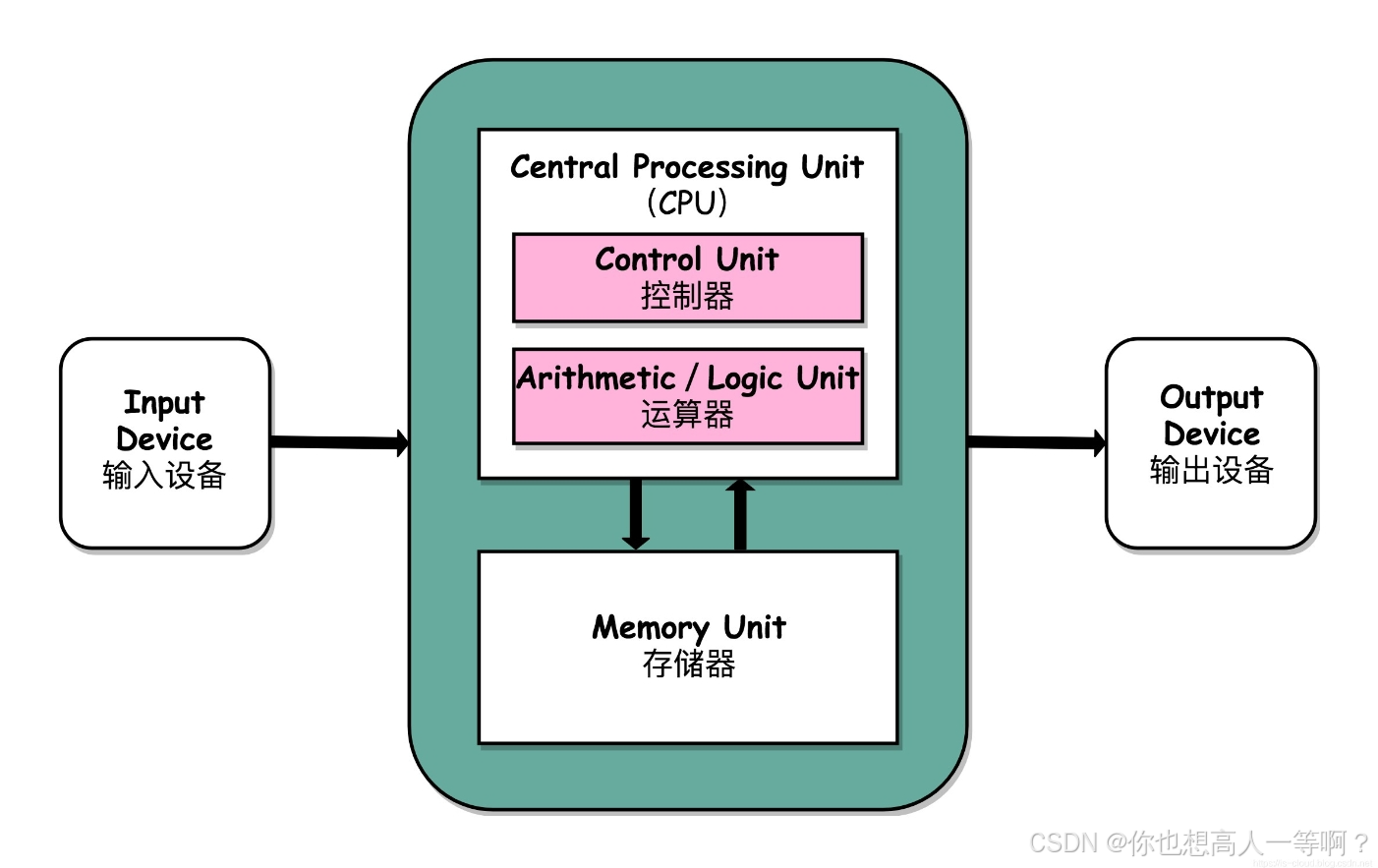 根据冯.诺依曼结构,计算机结构分为 5 大部分:运算器、控制器、存储器、输入设备、输出设备
