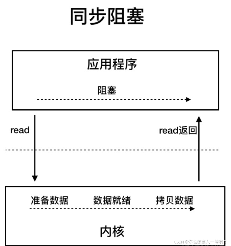 同步阻塞 IO 模型中,应用程序发起 read 调用后,会一直阻塞,直到内核把数据拷贝到用户空间