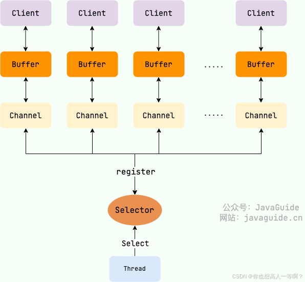 Java 中的 NIO ,有一个非常重要的选择器 ( Selector ) 的概念,也可以被称为 多路复用器。通过它,只需要一个线程便可以管理多个客户端连接。当客户端数据到了之后,才会为其服务